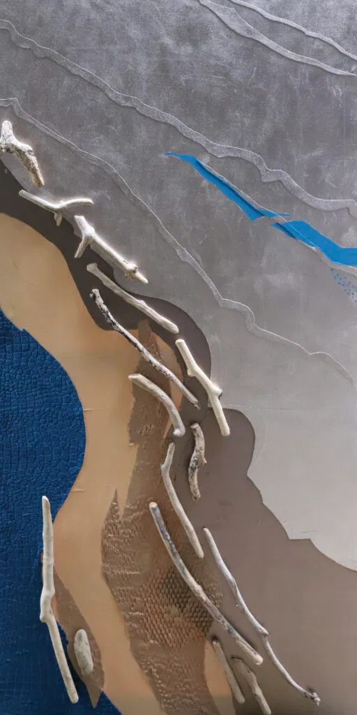 stof, acrylverf en houtjes aangespoeld op het strand bij burnmouth in schotland
